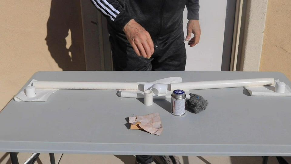 Glue the top elbow onto the PVC pipe. Wait 10 minutes for the glue to harden. Apply glue and connect the tee to the bottom, then quickly rotate the tee as you push the pipe in so the elbow, tee, and the ends of both PVC alignment pipes all touch the floor. Wait 10 minutes before removing the alignment pipes to do the other side support. Store all glued parts outdoors for 2 days to reduce the toxic glue fumes.